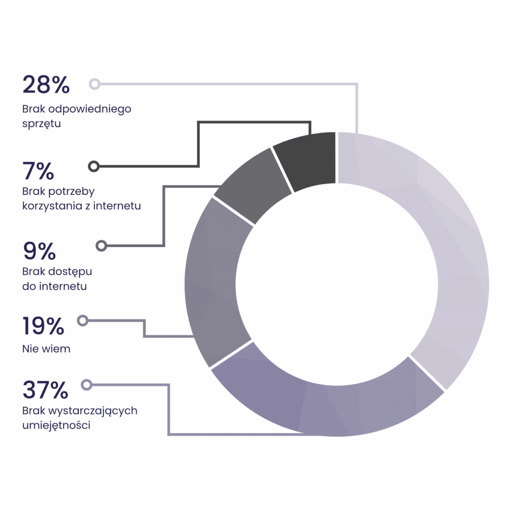 Największą barierą w korzystaniu z internetu dla seniorów pozostaje brak umiejętności cyfrowych (37%), co pokazuje, że problem ma charakter edukacyjny, a nie technologiczny. Na drugim miejscu wskazywano brak sprzętu (28%), co potwierdza, że dostępność narzędzi wciąż nie jest powszechna w tej grupie wiekowej. Może to oznaczać, że coraz więcej osób starszych dostrzega wartość internetu, ale potrzebuje wsparcia i praktycznych szkoleń, by móc z niego bezpiecznie i pewnie korzystać.
