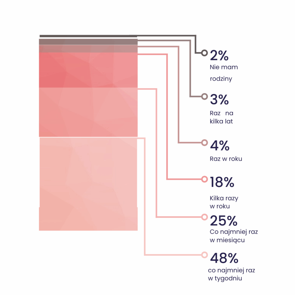 Na dobrostan życia osób starszych składa się wiele czynników, wśród których istotną rolę odgrywają relacje społeczne. Duża grupa Seniorów ma ograniczony kontakt z rodziną. 18% Seniorów deklaruję, że spotyka się z rodziną kilka razy na rok, a 3% – raz na kilka lat. W takiej sytuacji warto podjąć próbę nawiązania kontaktu choćby na odległość, przez telefon lub inne komunikatory. Skorzystają na tym obie strony — i starsi, i młodsi członkowie rodziny.