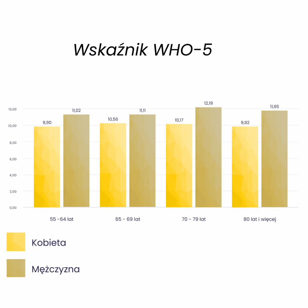 Co jest ważne, wynik poniżej 13 punktów stanowi wskazanie do badania w kierunku depresji. Podczas analizy wyników, okazało się, że 63% ma ten wskaźnik poniżej 13 co oznacza niski poziom dobrostanu i może sugerować ryzyko depresji. Najgorsze wyniki obserwuje się w wieku 55-64 u kobiet i mężczyzn, natomiast najlepsze u kobiet 65-69 i mężczyzn 70-79. Dane te podkreślają konieczność wzmacniania profilaktyki zdrowia psychicznego, a nie tylko leczenia chorób somatycznych.